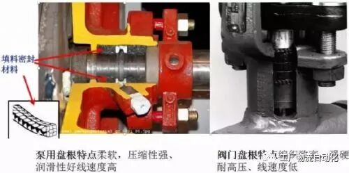 盘根通常由较柔软的线状物编织而成,通过截面积是正方形的条状物填充在密封腔体内,靠压盖产生压紧力,压紧填料,迫使填料压紧在密封表面(轴的外表面和密封腔)上,产生密封效果的径向力,因而起密封作用。